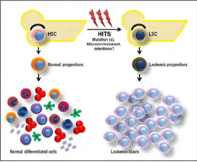 The Leukemic Stem Cell (LSC) represents a rare subpopulation of malignant cells within leukemia that possesses the ability to self-renew, differentiate, and sustain disease progression. Unlike bulk leukemic cells, which have limited proliferative capacity, LSCs exhibit stem cell–like properties similar to normal hematopoietic stem cells (HSCs), enabling them to resist conventional chemotherapy and drive relapse. These cells are characterized by specific surface markers such as CD34⁺CD38⁻ in acute myeloid leukemia (AML) and distinct molecular signatures involving dysregulated pathways like Wnt/β-catenin, Notch, Hedgehog, and PI3K/AKT/mTOR. LSCs maintain a quiescent state within the bone marrow niche, which provides a protective microenvironment against therapeutic stress. Understanding the biology of leukemic stem cells is crucial for the development of targeted therapies aimed at eradicating the root of leukemia, preventing minimal residual disease, and achieving long-term remission.