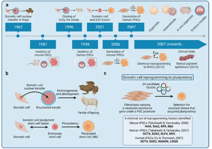 Molecular mechanisms of somatic cell reprogramming to iPSCs involve the conversion of differentiated somatic cells into a pluripotent state through the forced expression of specific transcription factors classically OCT4, SOX2, KLF4, and c-MYC (OSKM) as first demonstrated by Shinya Yamanaka in 2006. These factors act by remodeling the epigenetic landscape of the cell, silencing lineage-specific genes while activating pluripotency-associated networks. During reprogramming, chromatin undergoes extensive modifications: DNA methylation at promoters of pluripotency genes (such as NANOG and LIN28) is erased, histone acetylation increases, and repressive histone marks (like H3K9me3 and H3K27me3) are removed. This epigenetic remodeling facilitates the reactivation of endogenous pluripotency circuits that stabilize the iPSC state. Additionally, non-coding RNAs, signaling pathways (Wnt/β-catenin, TGF-β, and MAPK), and metabolic reprogramming play crucial roles cells shift from oxidative phosphorylation toward glycolysis, mimicking embryonic stem cell metabolism. Recent studies (2023–2025) have uncovered the involvement of chromatin remodelers such as BRG1, epigenetic modifiers like TET1/2, and RNA-binding proteins in fine-tuning the efficiency and fidelity of reprogramming. These discoveries enhance our understanding of how cell identity can be reset and are paving the way for safer, more controlled iPSC generation for regenerative medicine and toxicology applications